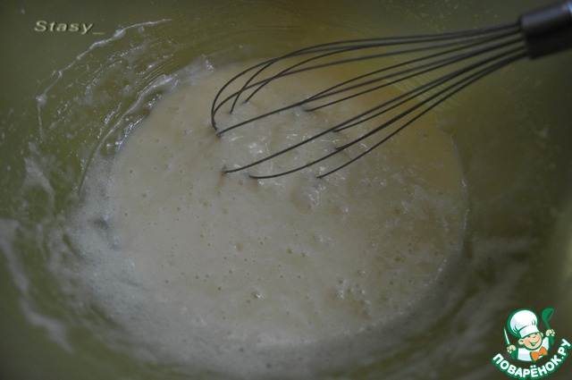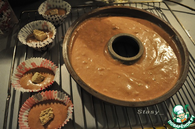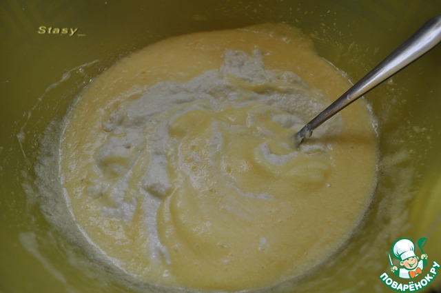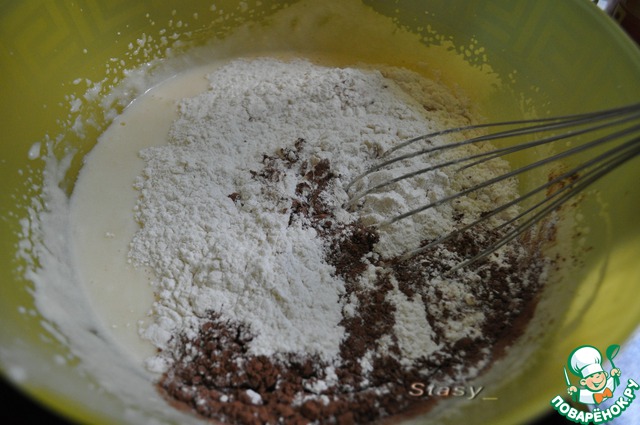 Теперь просеиваем в тесто муку с разрыхлителем, солью и какао. Замешиваем тесто: оно должно получиться негустое, ну, вы знаете, как на классический манник ;)