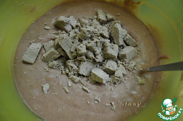Халву режем или ломаем небольшими кусочками. Дальше есть несколько вариантов на ваш выбор: добавить халву сейчас и равномерно размешать, или вылить часть теста в форму, выложить начинку, залить второй половинкой. А можно сразу всю смесь выложить и «утопить» в ней кусочки халвы. Тем или иным способом, но она должна оказаться в тесте, а оно – в форме =)