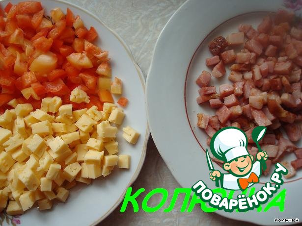 Перец, сыр и ветчину нарезаем кубиками.