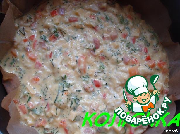 Начинку засыпаем в тесто, солим, перчим и перемешиваем.