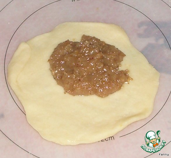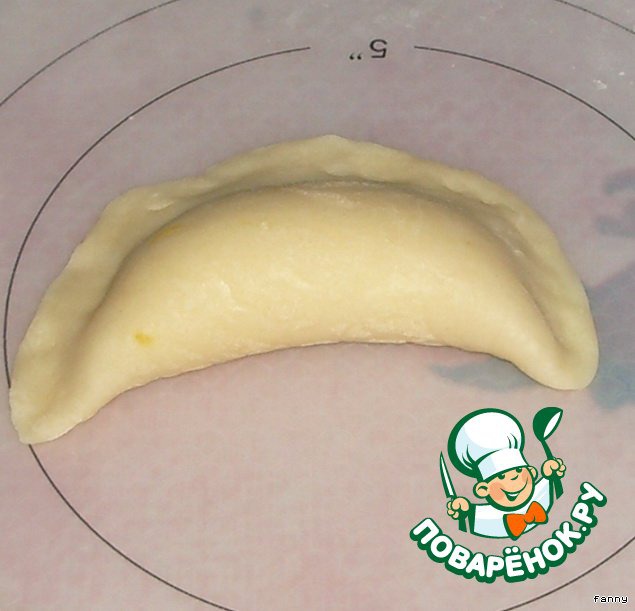 Лепешки сложить пополам и крепко прижать края, чтобы начинка не вытекала. Для этого предлагаю смазать края желтком, но и без этого нормально получается.
