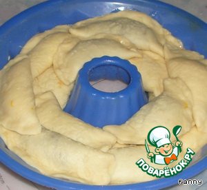 Для приготовления теста просеять муку, сделать углубление, положить туда разведенные в молоке дрожжи и немного сахара.