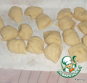 Тесто раскатать на присыпанной мукой поверхности в жгут, разрезать его на 3 равные части, каждую из которых разделить на 8 кусков. Скатать кусочки в шарики, каждый из них раскатать в лепешку.