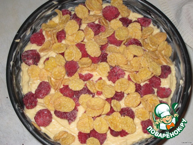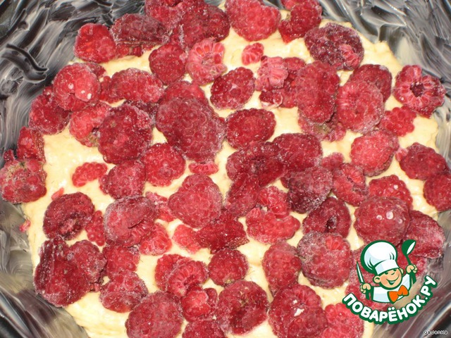 Выложить половину теста в форму, насыпать часть малины, слегка вдавить в тесто.
