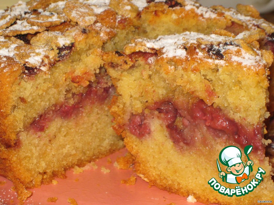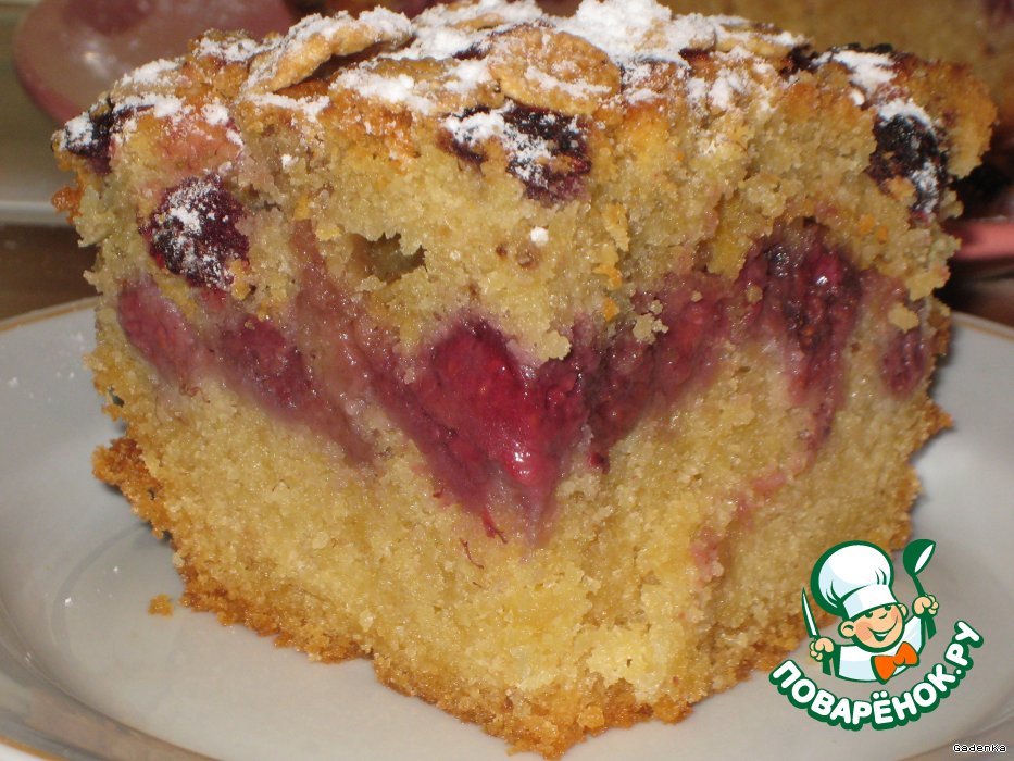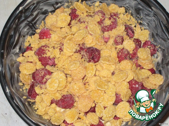 залить второй половиной теста, высыпать остальные ягоды и хлопья.