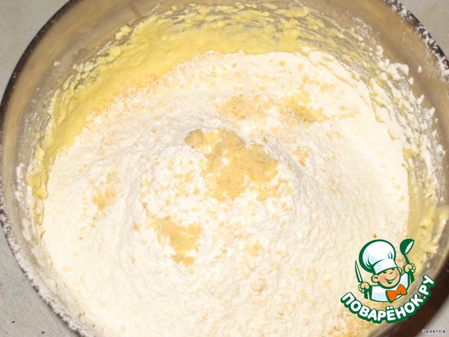 Муку с разрыхлителем просеять и смешать с молотым миндалем и крахмалом.