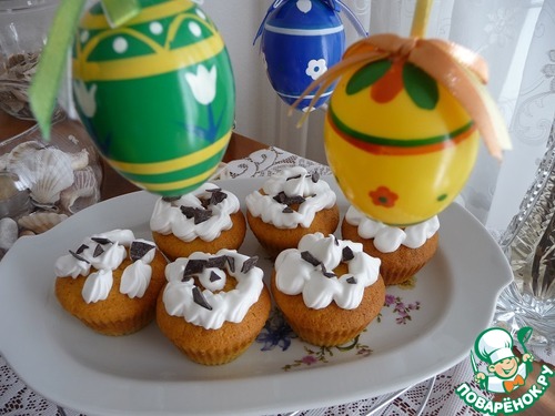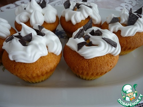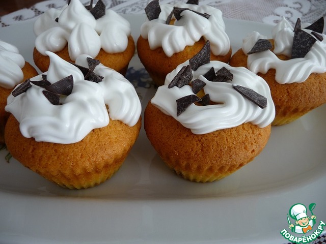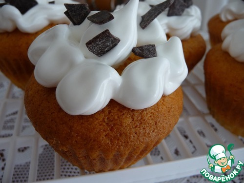 Ложкой или с помошью кондитерского шприца украсить остывшие кексы кремом, обсыпать шоколадной крошкой.