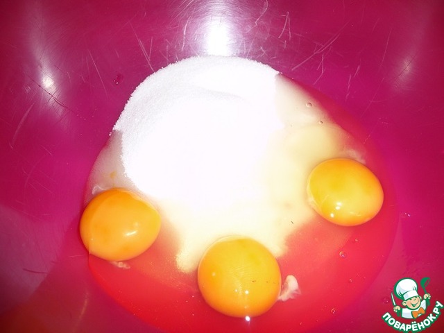 Сахар, ванильный сахар и яйца взбить в крепкую пену.