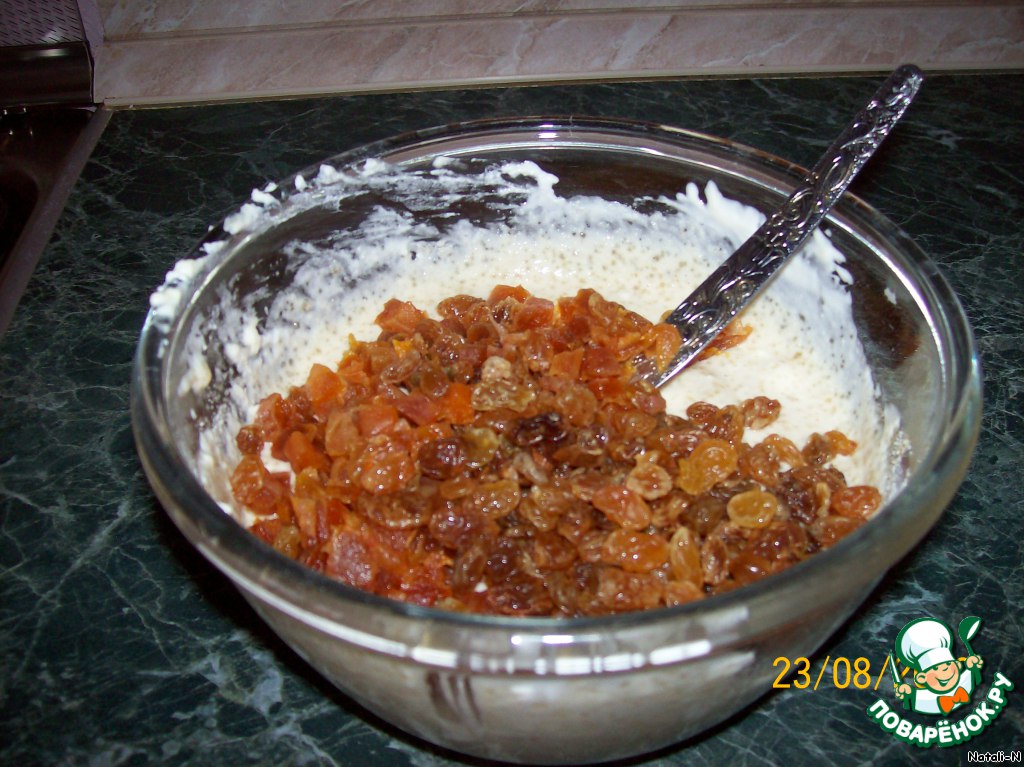 Курагу мелко нарезать и вместе с изюмом добавить в творожную массу, перемешать