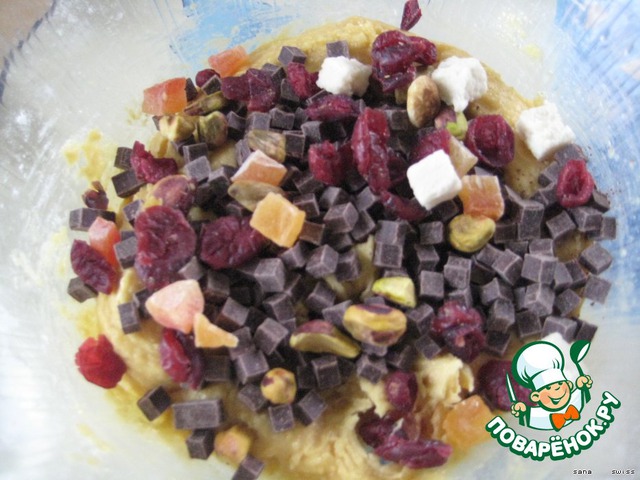 Добавить кусочки шоколада, сухофрукты, цукаты и фисташки;