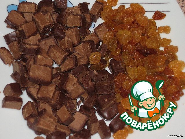 Муку смешать с разрыхлителем. Добавить в конфетно-изюмную жидкость. Если тесто жидковатое, то добавить еще муки.