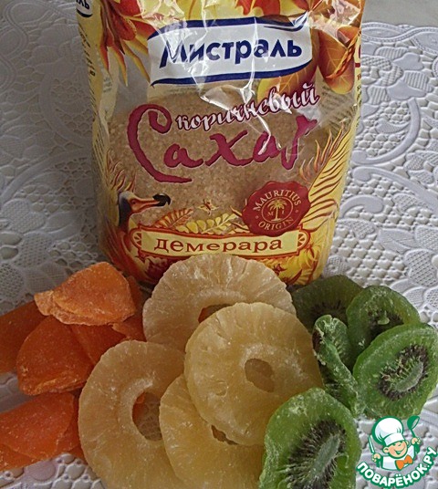 В этой выпечке я использовала сахар "Мистраль" Демерара и цукаты манго, киви и ананаса.