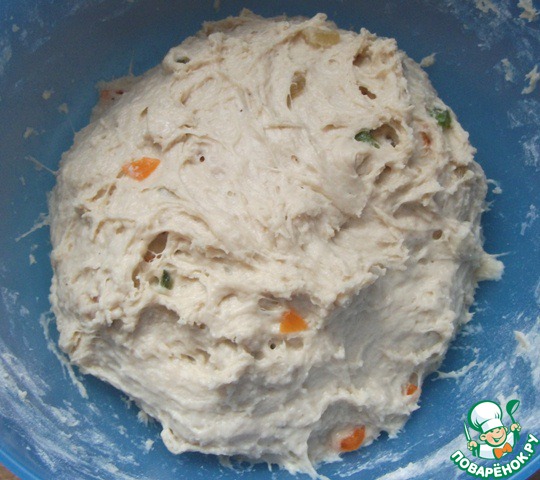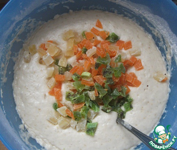 Добавить в сухую смесь 100 мл. растительного масла и 400 мл. тёплой воды, хорошо перемешать ложкой. Нарезать кубиками цукаты, вмешать в тесто и постепенно добавить оставшуюся муку.