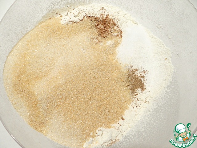 В миску просеиваю муку с разрыхлителем, добавляю молотую корицу, молотый мускатный орех, соль, коричневый сахар.