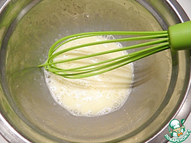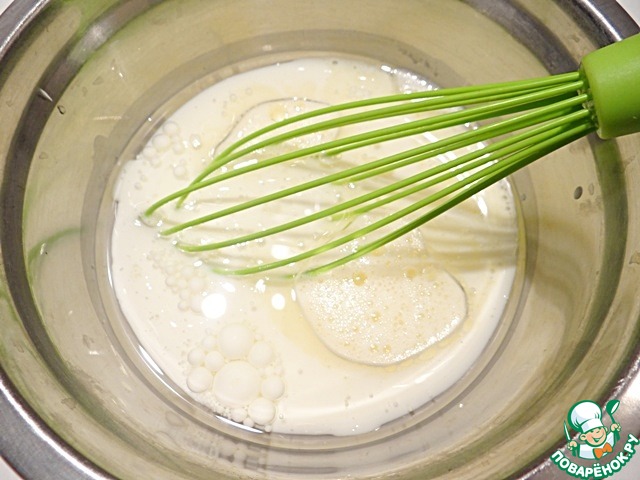 К взбитым яйцам добавляю молоко и растительное масло. Перемешиваю ингредиенты.