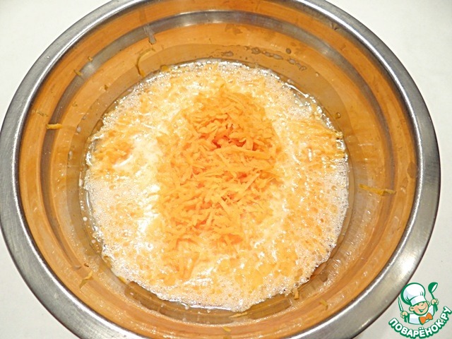 Добавляю к молочной смеси морковь, натертую на мелкой терке. Снова перемешиваю ингредиенты.
