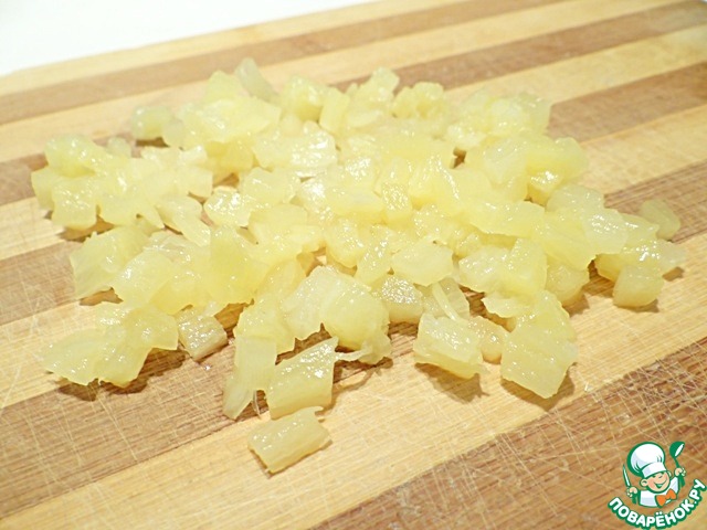Консервированные ананасы обсушиваю с помощью бумажного полотенца, нарезаю мелко кубиками.
