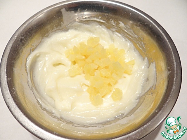 Добавляю ананасы, снова перемешиваю. Крем готов.