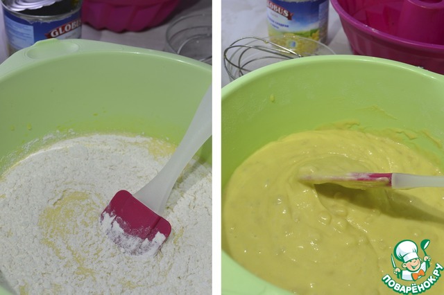 В просеянную муку добавить разрыхлитель и перемешать. Добавить в наше тесто и хорошо перемешать.