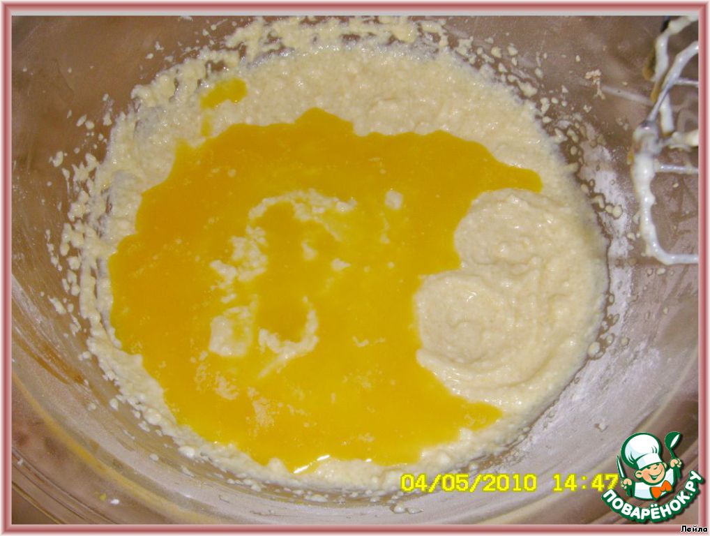 в конце масло (заранее растопить и охладить) добавить в творожную массу.