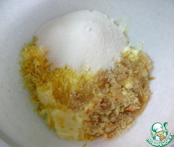 В чашу миксера поместить сливочное масло, сахар, цедру лимона и марципан.