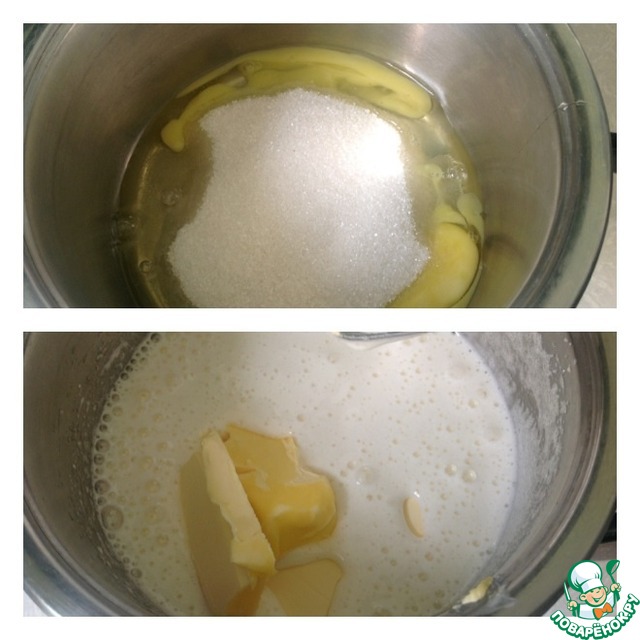 Яйца взбить с сахаром до бела. Добавить мягкий маргарин и взбить