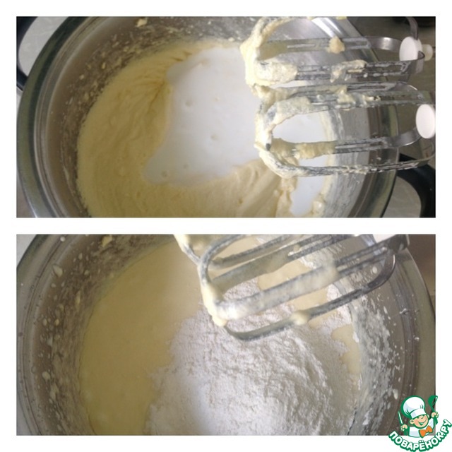 Добавить кефир и взбить. Далее муку с разрыхлителем и тщательно взбиваем