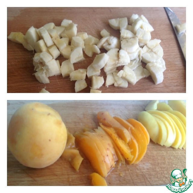 Бананы очистить и нарезать кубиками. Абрикос полосками