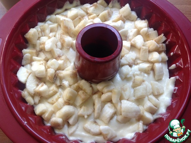 Далее остатки теста и бананы. Отправить пирог в предварительно разогретую духовку на 40 мин при 180 гр. У меня силиконовая форма, если у вас обычная, то выстелите дно формы пекарской бумагой