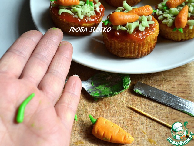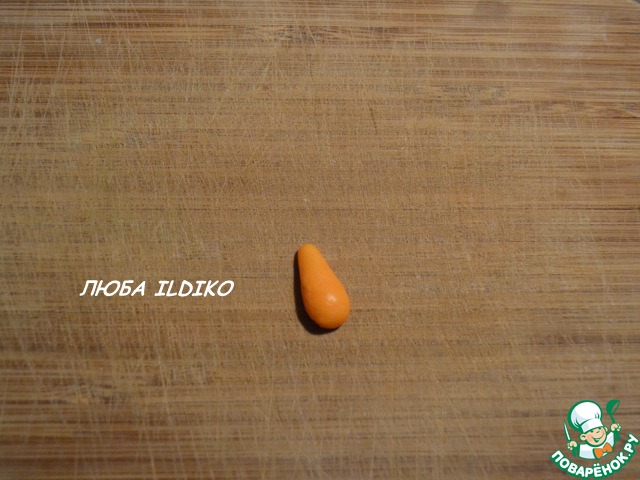 И на доске указательным пальцем раскатываем, прижимая края заготовки, сначала - один посильнее (это будет корень морковки), потом - второй, пошире - основание. Получается заготовка морковки. Всего для 12 кексов необходимо 24 морковки, можно и поиграть с размерами и количеством (будет стратегический запас на всякий случай).