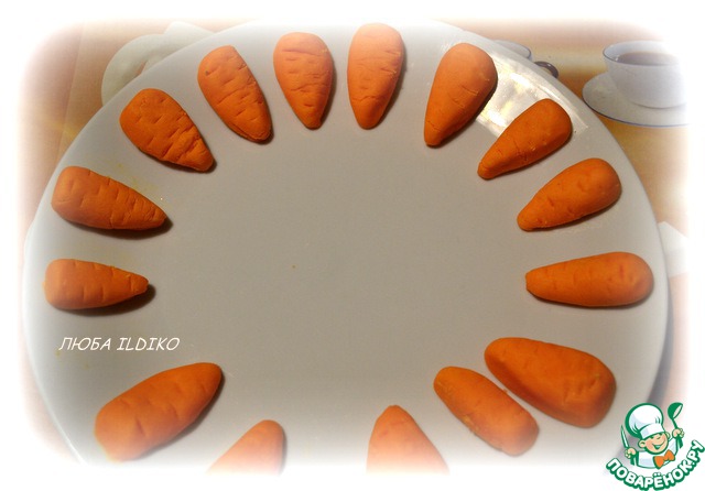 Раскладываем "морковки" на тарелку, пусть подсохнут. Можно сразу попробовать ещё на сырых сделать нарезку ножом или зубочисткой. Если плохо рисуется и клеится масса, пусть подсохнет - но недолго.