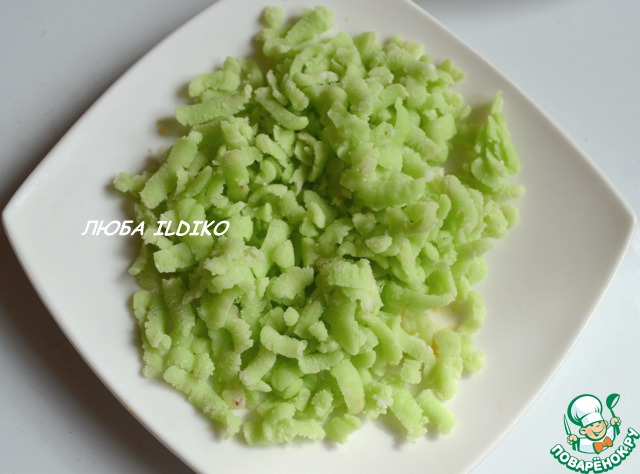 Всё хорошо пальчиками перетёрла, размяла и натёрла опять на крупной тёрке.. Трём, не спеша... мягко прижимаем к тёрке брусок и тянем на всю длину по тёрке. Стружка должна быть длинной: сверху в отверстия тёрки концом ножа проталкиваем натёртую стружку, при этом она не повреждается и остаётся длинной.