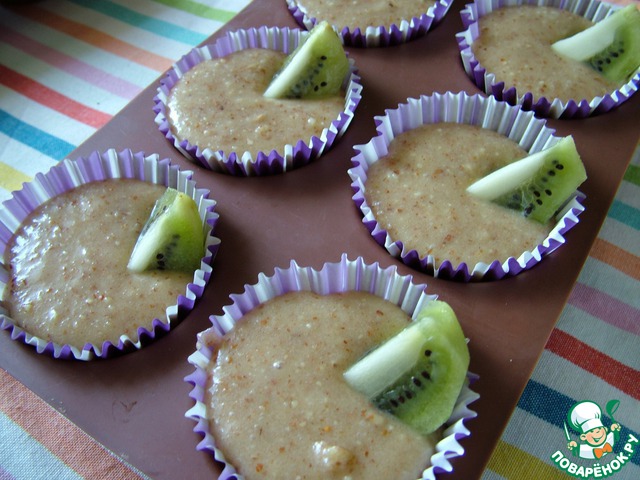 Разложите тесто в формочки, в каждую добавьте по кусочку киви.