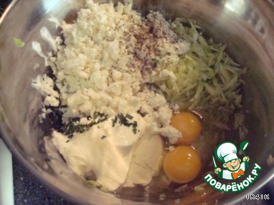 кабачки трем на терке и отжимаем сок. кладем сметану, яйца, масло, ломаную фету, мяту, соль, перец.