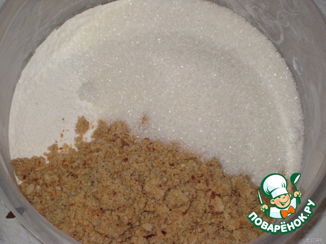 Молотые орехи смешать с 4 ст.л. сахара, половиной стакана муки