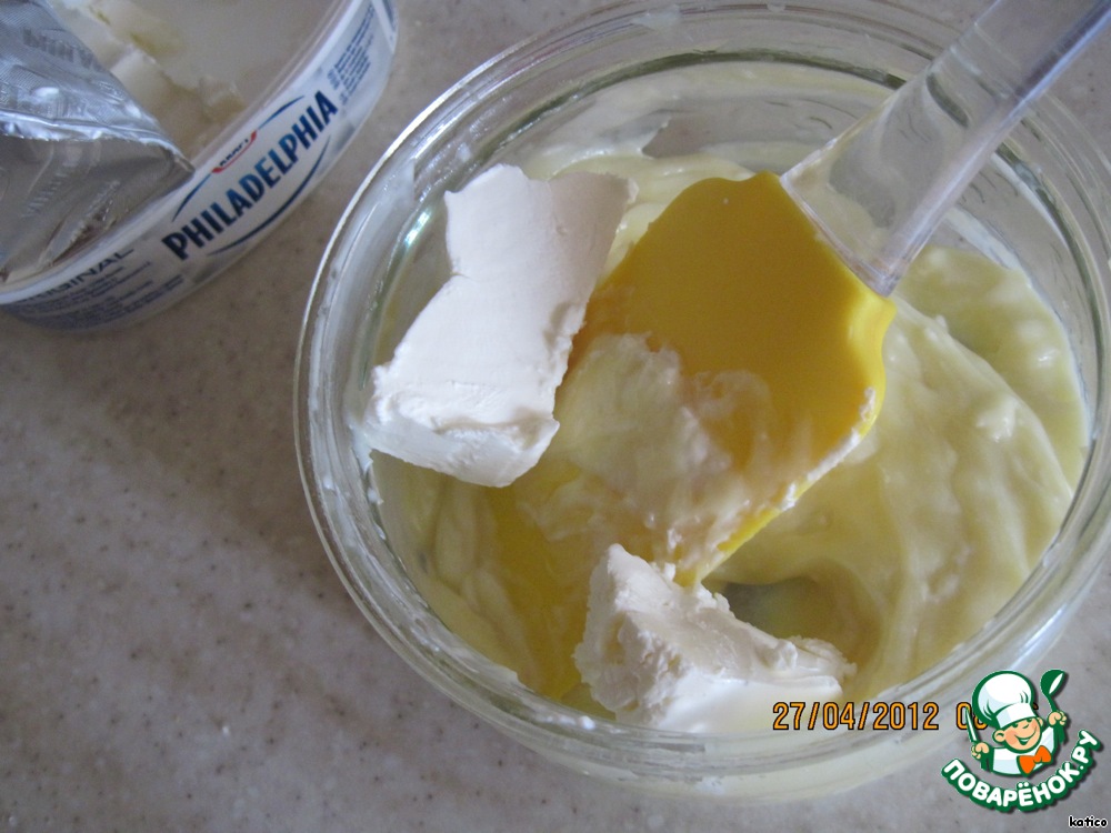 Добавить к нему сливочный сыр. Желательно, чтобы сливочный сыр был комнатной температуры, иначе будут комочки, а нам нужна однородная масса, которую потом убираем в холодильник.