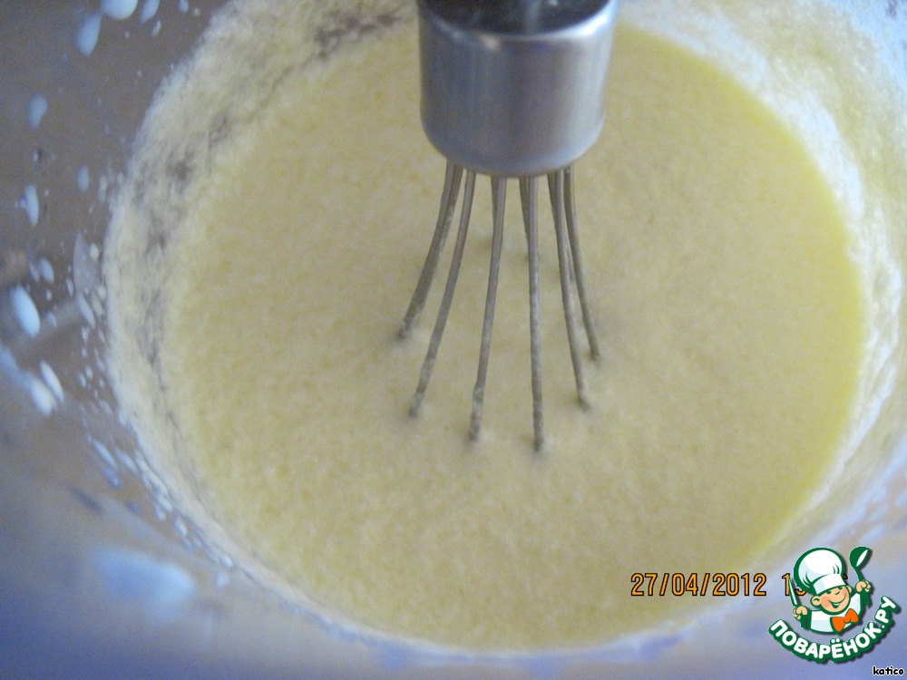 Затем добавляем муку (большой стакан) с разрыхлителем и щепоткой соли, у меня была вот такая мука.