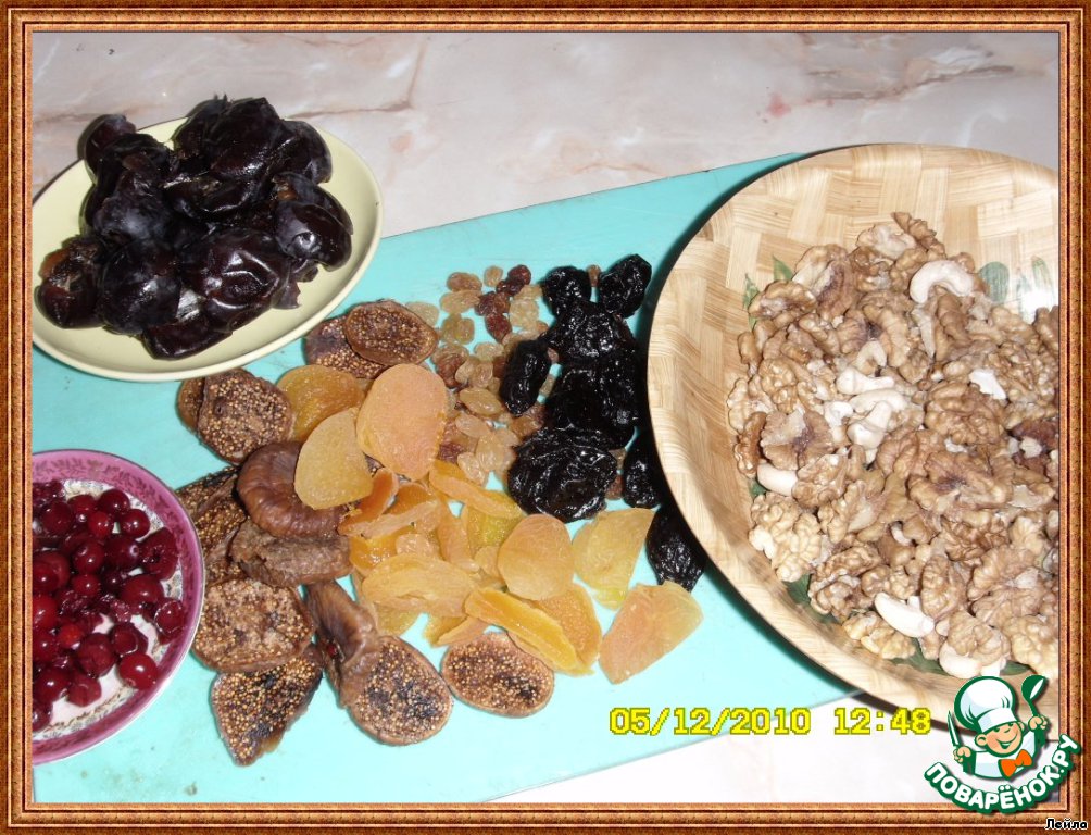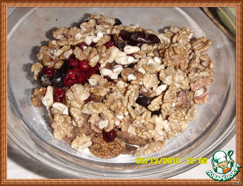 Сухофрукты можете подбирать на свое усмотрение. В общей сложности должно быть на 3 чашки орехов 2 и 1/2 чашки сухофруктов.[/quote]