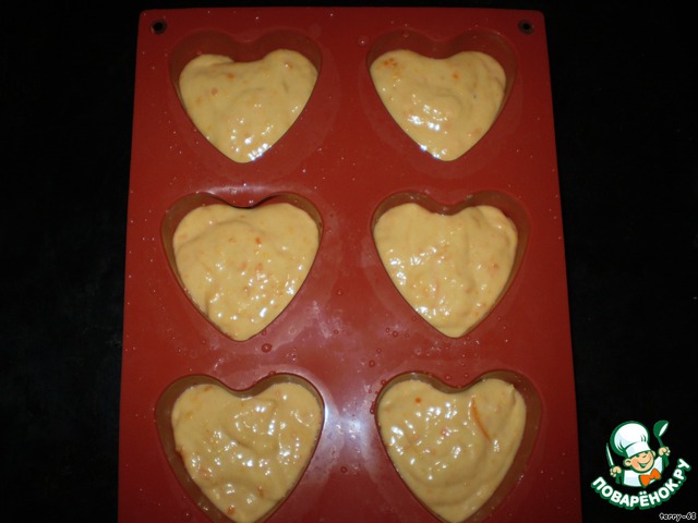 Формочки смазать сливочным маслом. Если у вас силиконовая форма, то просто сбрызнуть водой. Выложить тесто в формочки на 2/3 объёма.