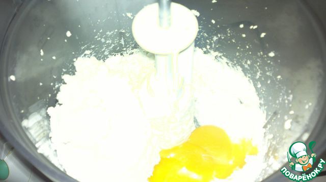 Творог взбиваем в блендере, добавив желтки, сахар, ванильный сахар, сливочное масло, крахмал, манную крупу, до однородности.