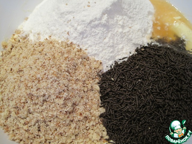 Добавим орехи, шоколад, коньяк и муку, просеянную с разрыхлителем. Перемешаем лопаткой.