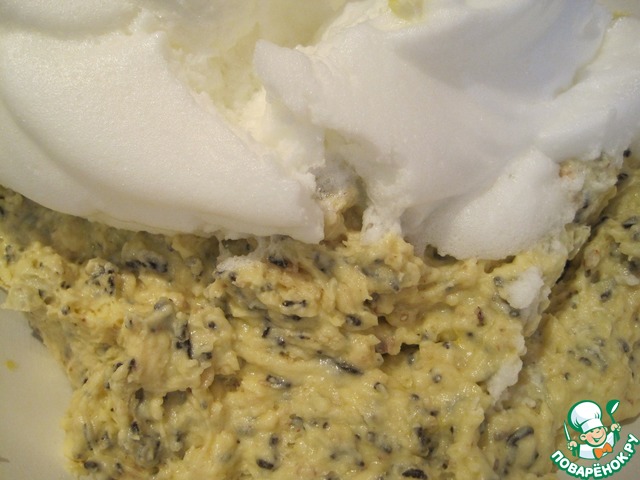 В последнюю очередь аккуратно введём в тесто взбитые белки. Тесто получится гуще, чем для бисквита, оно не стекает с лопатки, скорее спадает с неё.