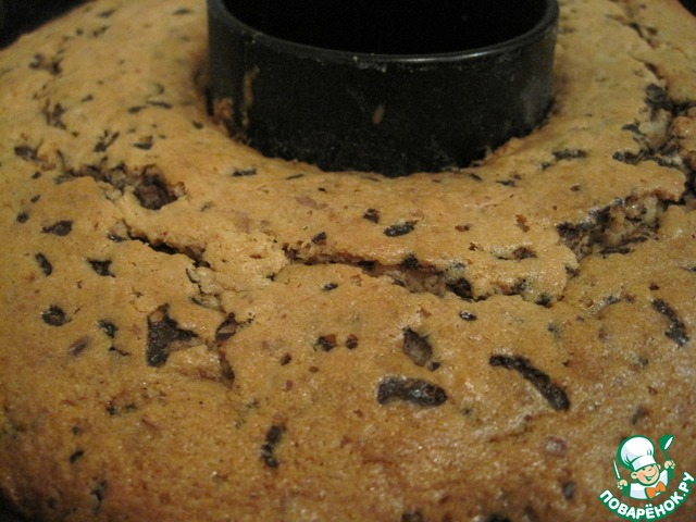 Разъёмную кольцевую форму (26 см диаметр) смажем сливочным маслом и присыплем мукой. Выложим тесто в форму и отправим в разогретую духовку выпекаться в течении часа или до сухой шпажки.