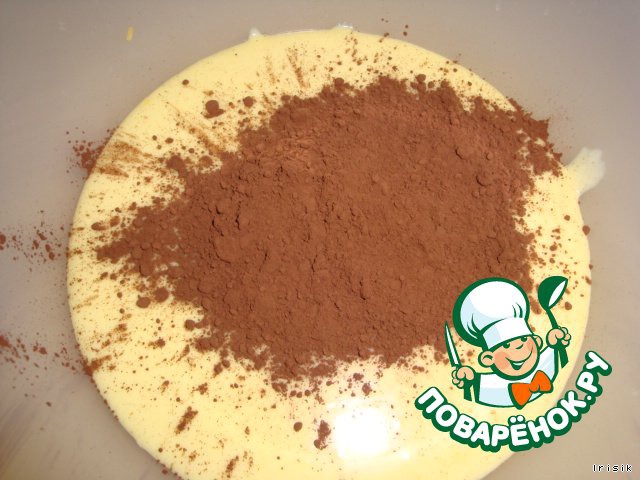 Тесто разделяем на две части. Одну оставляем светлой, а во вторую добавляем ложку какао, хорошо перемешиваем.