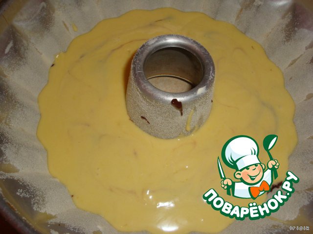 В форму нальем половину светлого теста, на нее аккуратно тесто с какао, чтоб не перемешалось, и сверху опять польем светлым тестом.