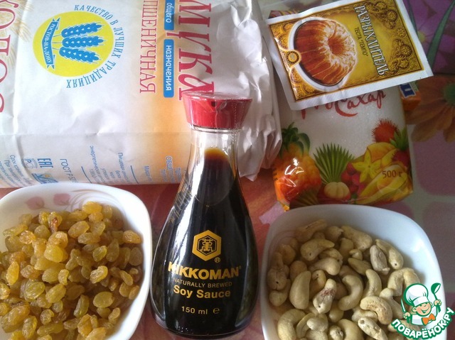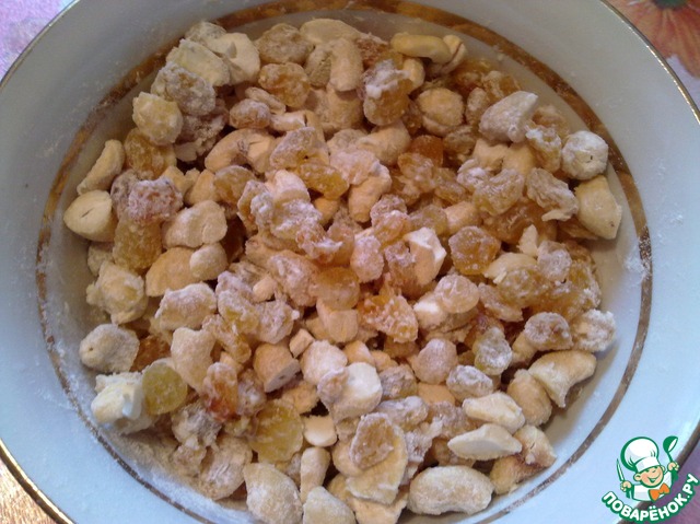 Орехи кешью порубите, смешайте с ложкой муки и изюмом.