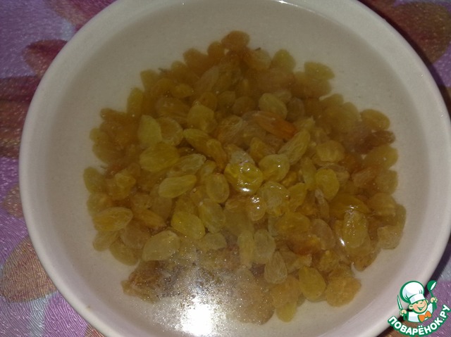 Изюм залейте кипятком, оставьте на 15 минут, откиньте на дуршлаг, обсушите.