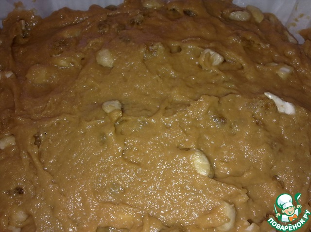 Добавьте в тесто орехи с изюмом. Выложите тесто в форму, застеленную пергаментом. У меня форма размером 22x16x5 см. Выпекайте в духовке 50 минут при 170 градусах.