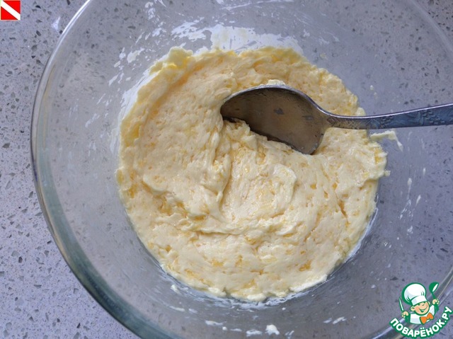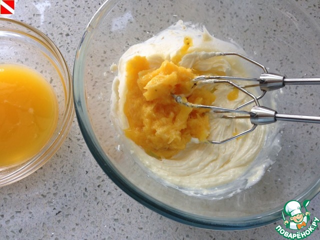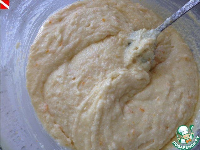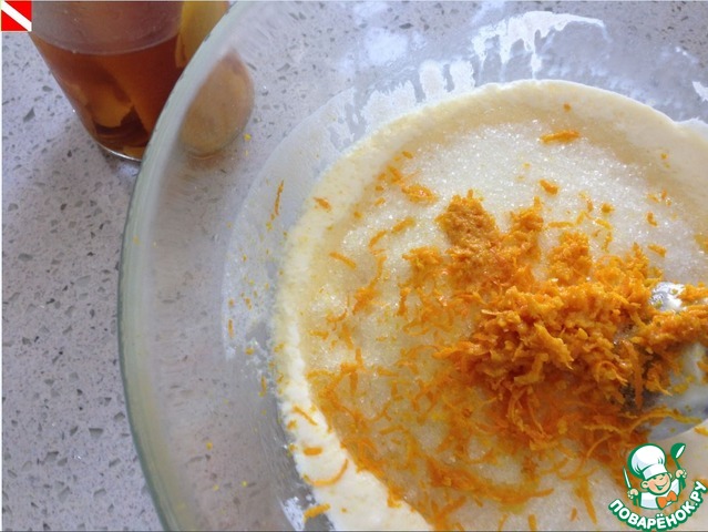 Добавляем сахар, цедру одного апельсина, яйцо и гашеную соду. Для усиления апельсинового вкуса я еще добавляю 1 ч. л. апельсинового экстракта (готовлю его сама - http://www.povarenok .ru/recipes/show/888 30/)