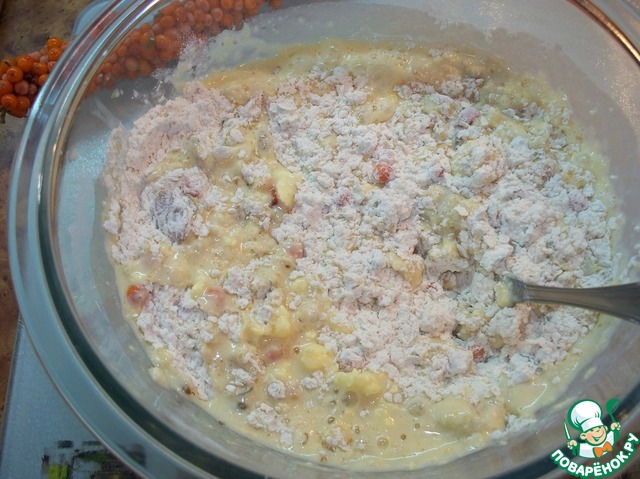 В большой миске соединяем все сухие ингредиенты, ягоды и изюм. Все хорошенько перемешиваем.